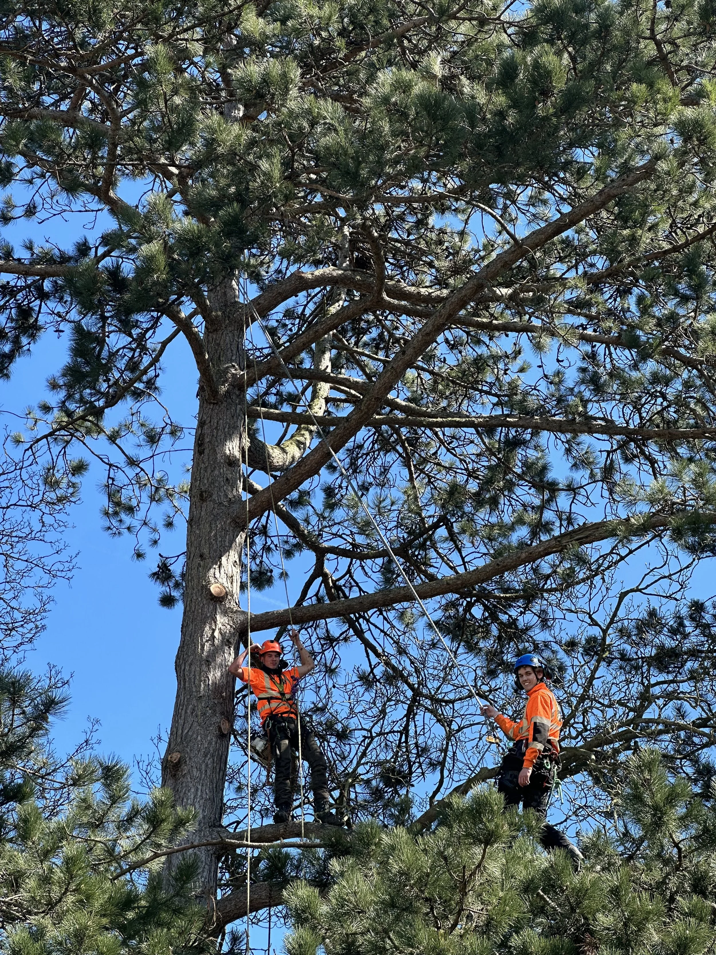 Depending on access, we can fell trees from the ground or dismantle them section by section using ropes, rigging and controlled lowering. Where needed, we can also use a cherry picker.